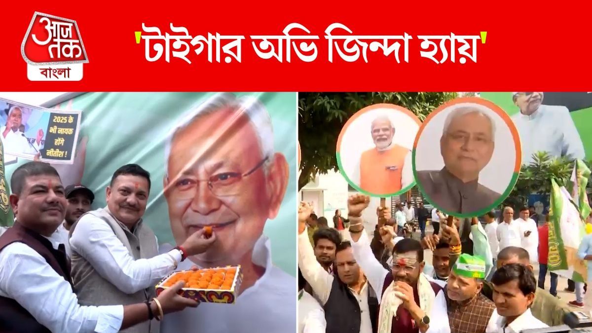 নীতীশ কুমারের নেতৃত্বাধীন NDA জোটের বিপুল জয়ে JDU দফতরের বাইচ্ছে উচ্ছাস। উঠল, 'নীতীশ কুমার জিন্দাবাদ' স্লোগান। পড়ল 'টাইগার অভি জিন্দা হ্যায়' স্লোগান। লাড্ডু বিলি করা হচ্ছে দফতরের বাইরে। ফাটছে বাজি, উড়ছে আবির।