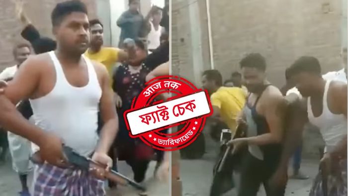 এখানে কয়েকজন মানুষকে বন্দুক হাতে দেখা যাচ্ছে। তাদের মধ্যে কয়েকজন পুরুষকে লুঙ্গি এবং কিছুজনকে মাথায় টুপি ও পাজামা-পাঞ্জাবী পরিহিত অবস্থায় দেখা যাচ্ছে। ভিডিওটি শেয়ার করে দাবি করা হচ্ছে, সেটি সম্প্রতি মুর্শিদাবাদের বেলডাঙায় দুই গোষ্ঠীর সংঘর্ষের দৃশ্য। উদাহরণস্বরূপ, এক ফেসবুক ব্যবহারকারী ভাইরাল ভিডিওটি শেয়ার করে লিখেছেন, “বেলডাঙা আজকের ভিডিও।”