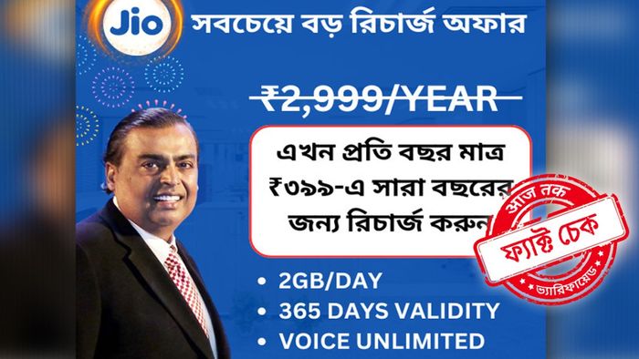 এই আবহে একটি পোস্ট সোশ্যাল মিডিয়ায় বেশ শেয়ার করা হচ্ছে। সেখানে দাবি করা হচ্ছে, রিলায়েন্স জিও-র পক্ষ থেকে নাকি ২৯৯৯ টাকা মূল্যের রিচার্জ প্যাক মাত্র ৩৯৯ টাকায় দেওয়া হচ্ছে।