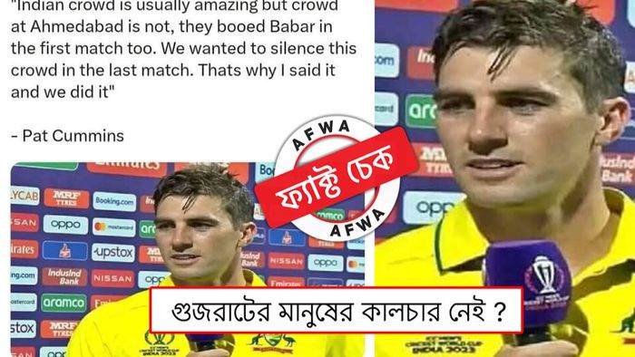 এরপর আমরা কামিন্সের ম্যাচ পরবর্তী সাংবাদিক সম্মেলনের ভিডিয়োটিও খুঁটিয়ে দেখি। সেখানে তিনি একবারও বাবর আজমের নাম করেননি, বা আহমেদাবাদের দর্শকদের নিয়ে কোনও কটূ কথা বলেননি।