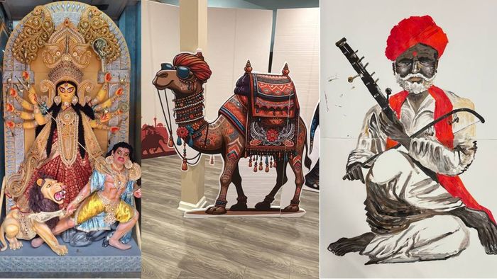 এ বারের পুজোয় অবশ্য থিম রাজস্থান। সেই কারণে উট, হাতি আর ময়ূর ও রাজস্থানি রাজপ্রাসাদে ঢেকেছে এখানকার মণ্ডপ। সবমিলিয়ে নিউ জার্সিতে উঠে এসেছে এক টুকরো রাজস্থান।
