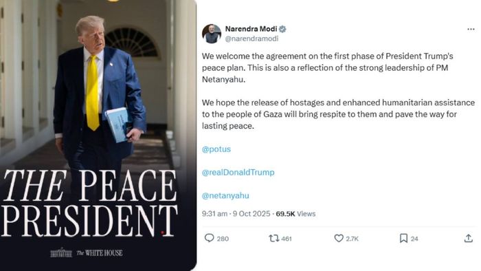 আর এমন সময় ট্যুইটের মাধ্যমে মার্কিন প্রেসিডেন্টের ভূয়সী প্রশংসা করেন ভারতের প্রধানমন্ত্রী নরেন্দ্র মোদীও। তিনি ট্যুইট করে লেখেন, 'আমরা প্রেসিডেন্ট ট্রাম্পের শান্তি পরিকল্পনার প্রথম পর্যায়ের চুক্তিকে স্বাগত জানাই। এটা প্রধানমন্ত্রী নেতানিয়াহুর শক্তিশালী নেতৃত্বের প্রতিফলনও বটে।