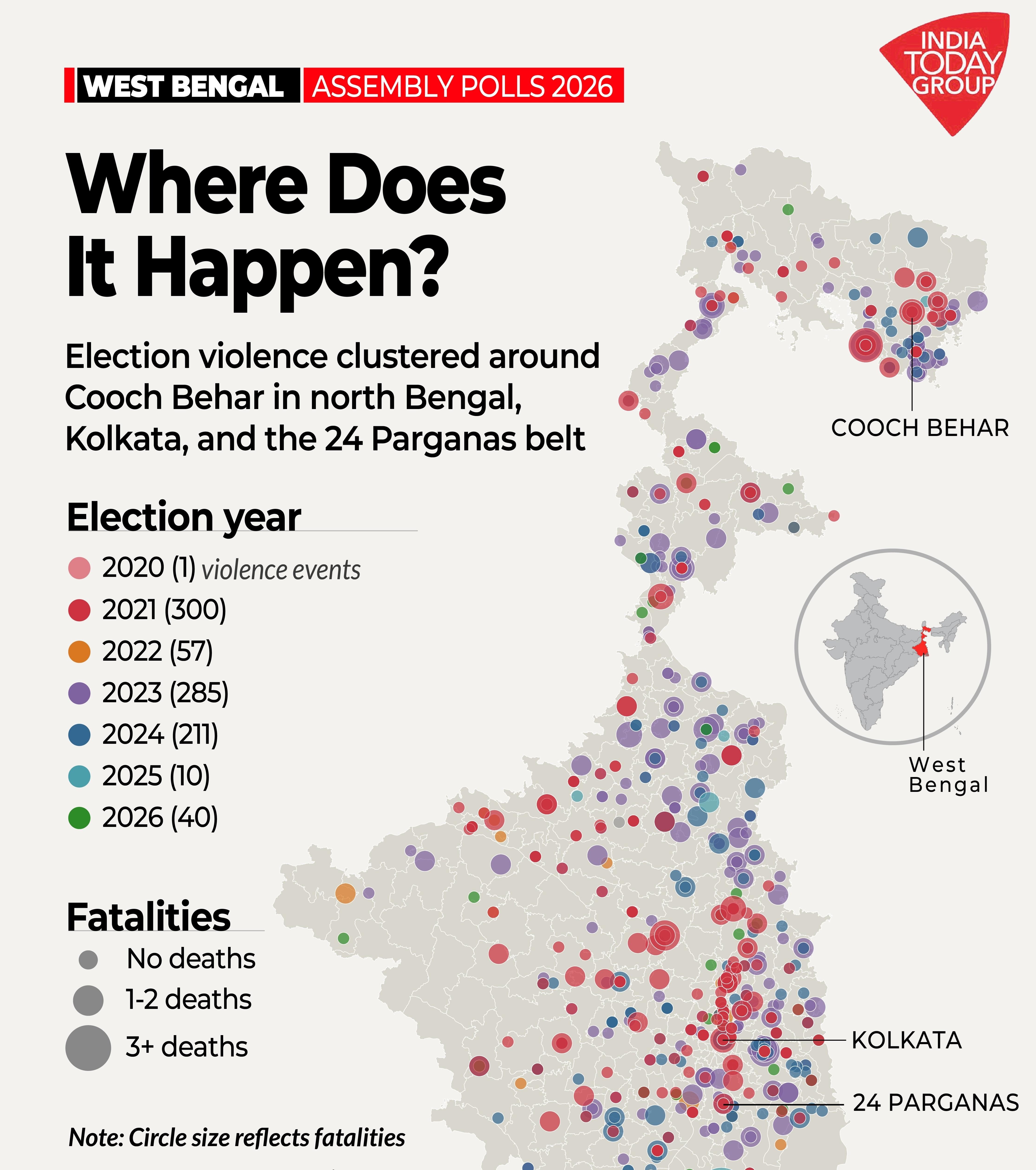 ২০২১ সালের ভোটে সবথেকে বেশি হিংসার সাক্ষী থেকে পশ্চিমবঙ্গ। ৩০০টি হিংসার ঘটনা ঘটেছিল। মৃত্যু হয়েছিল ৫৮ জনের। এরপরই ছিল ২০২৪ সালের অন্ধ্রপ্রদেশের ভোট। সেখানে হিংসার ঘটনার সংখ্যা ছিল ৮৯, প্রাণহানি হয়েছিল ৩ জনের। ACLED-এর নথিভুক্ত তথ্য অনুযায়ী, ২০২০ সাল থেকে বিধানসভা, সংসদীয় এবং স্থানীয় নির্বাচন মিলিয়ে ভারতে নির্বাচন-সম্পর্কিত মোট সহিংস ঘটনার ৩৫ শতাংশ (২,৫৯৩টির মধ্যে ৯০৪টি) এবং নির্বাচন-সম্পর্কিত প্রাণহানির ৫১ শতাংশ (৩২৯টির মধ্যে ১৬৮টি) ঘটনা শুধুমাত্র পশ্চিমবঙ্গেই ঘটেছে।