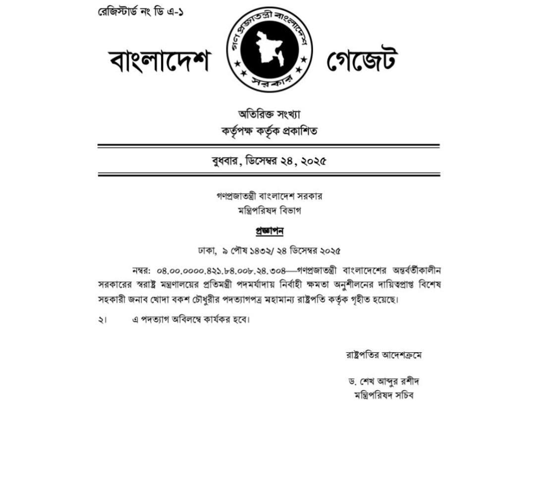 বাংলাদেশের স্বরাষ্ট্র মন্ত্রকের বিশেষ সহকারী উপদেষ্টা খোদাবক্স চৌধুরীবাংলাদেশের স্বরাষ্ট্র মন্ত্রকের দায়িত্বে থাকা প্রধান উপদেষ্টার বিশেষ সহকারী খোদাবক্স চৌধুরী পদত্যাগ করেছেন। বুধবার, ২৪ ডিসেম্বর রাষ্ট্রপতি তাঁর পদত্যাগপত্র গ্রহণ করেছেন। খোদাবক্ষকে গত বছরের ১১ নভেম্বর প্রধান উপদেষ্টার বিশেষ সহকারী হিসেবে নিয়োগ করা হয়।