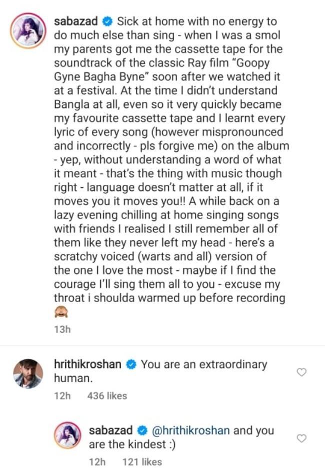 ইনস্টাগ্রামে তার একটি ভিডিও শেয়ার করেছেন সাবা আজাদ। এই ভিডিওতে তিনি সত্যজিৎ রায়ের (Satyajit Ray) বাংলা ছবি গুপি গাইন বাঘা বাইন-এর (Goopy Gyne Bagha Byne) মহারাজা তোমারে সেলাম গানটি গাইছেন। সাবার কন্ঠ আপনার হৃদয় ছুঁয়ে যাবে। তার গান শুনে আপনি তাকে বারবার শুনতে চাইবেন, ভিডিওটিতে তাকে এত চমৎকার গান গাইতে শোনা যায়। এমন পরিস্থিতিতে মনে হচ্ছে সোশ্যাল মিডিয়া ব্যবহারকারীদের পাশাপাশি হৃত্বিক রোশনও তার গান শুনে মোহগ্রস্ত হয়ে পড়েছেন। কথিত বান্ধবী সাবার ভিডিও নিয়ে প্রেমময় মন্তব্য করেছেন হৃতিক।