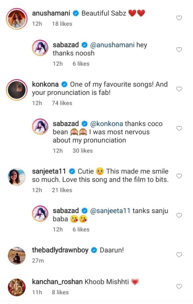 এই চমৎকার ভিডিওটিতে হৃত্বিক রোশন মন্তব্য করেছেন, 'তুমি একজন অসাধারণ মানুষ।' কথিত প্রেমিক হৃতিকের মন্তব্যের জবাবে সাবা লিখেছেন, 'এবং তুমি সবচেয়ে দয়ালু।' অভিনেত্রী কঙ্কনা সেন শর্মা লিখেছেন, 'আমার খুব পছন্দের একটি গান। আর তোমার উচ্চারণ পারফেক্ট ছিল। জবাবে সাবা আজাদ লিখেছেন, 'ধন্যবাদ কোকো বিনস। আমি উচ্চারণ নিয়ে সবচেয়ে নার্ভাস ছিলাম।