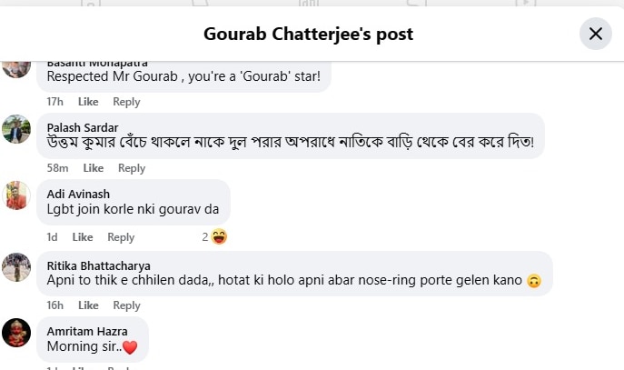 নেটিজেনের একাংশ গৌরবের এই লুকসের নিন্দা করেছেন। কেউ লিখেছেন, উত্তম কুমার বেঁচে থাকলে নাকে দুল পরার অপরাধে নাতিকে বাড়ি থেকে বের করে দিত। কেউ আবার লিখেছেন, এলজিবিটি জয়েন করলে নাকি। আবার কেউ লেখেন, নোসপিন পরতে গেলেন কেন। আবার কেউ মহানায়ককে টেনে বলেন, উত্তম কুমারের পরিবারের কলঙ্ক। যদিও এইসব ট্রোলিং নিয়ে মোটেও মাথা ঘামাতে রাজি নন। বরং নিজের লুকস নিয়ে এক্সপেরিমেন্ট করতেই পছন্দ করেন তিনি।