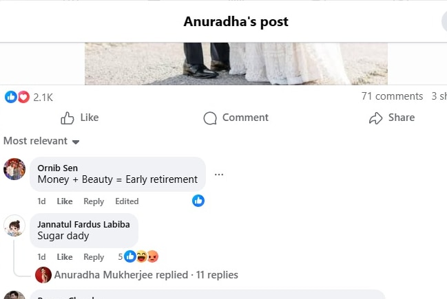 অভিনেত্রী অনুরাধা মুখোপাধ্যায় তনুশ্রীর বিয়ের ছবি পোস্ট করে নবদম্পতিকে শুভেচ্ছা জানিয়েছেন। আর সেই পোস্টেই তনুশ্রীকে কটাক্ষ করেছেন বেশ কিছু নেটিজেন। সেখানে একজন লেখেন, সুগার ড্যাডি। আবার কেউ লেখেন, দুঃখিত তাও বলছি কাকু আর ভাইঝি লাগছে। আবার কেউ লেখেন এটা বর না দাদু। তবে অনেকেই এই পোস্টে সুগার ড্যাডি মন্তব্য করেছেন। তবে এই ধরনের মন্তব্যে তনুশ্রী কোনও পাল্টা জবাব না দিলেও, অনুরাধা মোক্ষম জবাব দিয়েছেন। অনুরাধা লেখেন, ‘তুমিও নিজের জন্য একজন খোঁজো। যদি তোমার মনে হয় আইনত বিয়ে করা মানে সুগার ড্য়াডি’।
