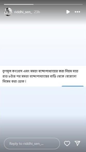 অভিনেতা ঋদ্ধি সেন সরকার পক্ষের কোনও অনুষ্ঠানেই নিজেকে রাখেন না। তাই সোজা সাপ্টা মন্তব্য করতে পিছু পা হন না অভিনেতা। এবারেও মুখ্যমন্ত্রীর মন্তব্য নিয়ে সুর চড়ালেন ঋদ্ধি। অভিনেতা লেখেন, তৃণমূল কংগ্রেস এবং মমতা বন্দোপাধ্যায়ের করা নিয়ম মতে রাত ৮টার পর মমতা বন্দোপাধ্যায়ের বাড়ি থেকে বেরোনো নিষেধ করা হোক। তবে শুধু ঋদ্ধি নয়, মমতা বন্দ্যোপাধ্যায়ের এই মন্তব্য নিয়ে সরব হয়েছেন টলিপাড়ার অনেক তারকারাই।