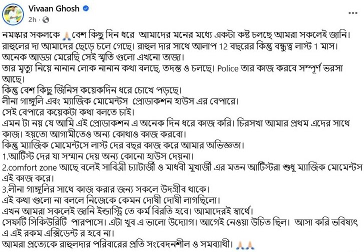 ফেসবুকে ভিভান লেখেন, 'নমস্কার সকলকে বেশ কিছু দিন ধরে আমাদের মনের মধ্যে একটা কষ্ট চলছে আমরা সকলেই জানি। রাহুলের দা আমাদের ছেড়ে চলে গেছে। রাহুল দার সাথে আলাপ ১২ বছরের কিন্তু বন্ধুত্ব লাস্ট ১ মাস। অনেক আড্ডা মেরেছি সেই স্মৃতি গুলো এখনো তাজা। তার মৃত্যু নিয়ে নানান লোক নানান কথা বলছে, তদন্ত ও চলছে। পুলিশ তার কাজ করবে সম্পূর্ণ ভরসা আছে। কিন্তু বেশ কিছু জিনিস কয়েকদিন ধরে চোখে পড়ছে। লীনা গাঙ্গুলি এবং ম্যাজিক মোমেন্টস প্রোডাকশন হাউজের ব্যাপারে। সেই ব্যাপারে কয়েকটা কথা বলতে চাই।' এরপরই ভিভান তাঁর পোস্টে লীনা গঙ্গোপাধ্যায়ের প্রযোজনা সংস্থার ভূয়সী প্রশংসা করেন। তিনি লেখেন, 'এমন টা নয় যে আমি এই প্রোডাকশন এ অনেক দিন ধরে কাজ করি। চিরসখা আমার প্রথম এদের সাথে কাজ। হয়তো আগামীতেও অন্য কোথাও কাজ করব। কিন্তু ম্যাজিক মোমেন্টসে লাস্ট দেড় বছর কাজ করে আমার অভিজ্ঞতা। 1.আর্টিস্ট দের যা সম্মান দেয় অন্য কোনো হাউস দেয়না। 2. কমফোর্ট জোন আছে বলেই সাবিত্রী চ্যাটার্জী ও মাধবী মুখার্জী এর মতন আর্টিস্টরা শুধু ম্যাজিক মোমেন্টস এই কাজ করে। 3.লীনা গাঙ্গুলির সাথে কাজ করার জন্য সকলে উদগ্রীব থাকে। এই কথা গুলো না বললে নিজেকে কেমন দোষী দোষী লাগছিলো। এখন আমরা সকলেই জানি ইন্ডাস্ট্রি তে কর্ম বিরতি হবে। আমাদেরই স্বার্থে। সেফটি সিকিউরিটি পারপাসে। এটা খুব এ ভালো উদ্যোগ। আগেই নেওয়া উচিত ছিল। আশা করি ভবিষ্যৎ-এ এই রকম অ্যাক্সিডেন্ট আর হবে না। আমরা প্রত্যেকে রাহুলদার পরিবারের প্রতি সংবেদনশীল ও সমব্যথী।'