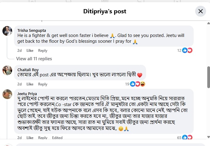 দিতিপ্রিয়া লেখেন, 'আমার সহকর্মীর দ্রুত সুস্থতা কামনা করি। তাড়াতাড়ি সুস্থ হয়ে ওঠ। এই পোস্ট করতেই চূড়ান্ত ট্রোলের মুখে পড়েন দিতিপ্রিয়া। কেউ লেখেন, লোক দেখানো আরোগ্য কামনা করছেন কেন? কেউ লেখেন, কোন সহ-অভিনেতার কথা বলছেন। আবার কেউ লিখেছেন, তো জনদরদী, মানবতার ফেরিওয়ালী ম্যাডাম রানী, আপনি আপনার কোন co-star-এর সুস্থতা কামনা করলেন। আর এক ব্যবহারকারী লেখেন, দু লাইনের পোস্ট না করলে পারতেন,ম্যাডাম দিতিপ্রিয়া, মনে হচ্ছে অনুমতি নিয়ে সারারাত পরে পোস্ট করলেন, Co-star-কে জানতে পারি, ওই মানুষটার তো একটা নাম আছে সেটা কি ভুলে গেছেন? যদিও এইসব ট্রোলের কোনও জবাব দেয়নি দিতিপ্রিয়া।
