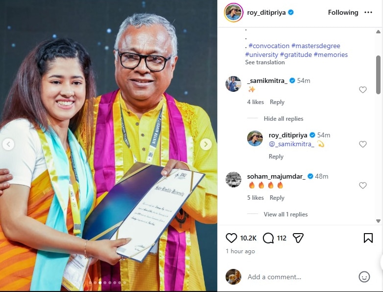 বাকি বন্ধুদের সঙ্গেও হাসিমুখে ছবি তুললেন দিতিপ্রিয়া। শংসাপত্র হাতে নিয়ে বেশ কয়েকটি ছবিও তোলেন তিনি। গত বছরেই সমাজবিজ্ঞানে মাস্টার্স ডিগ্রি অর্জন করেন নায়িকা। সেই সময় ডিসার্টেশন পেপার জমা দিতে গিয়ে সেই অভিজ্ঞতা ভাগ করে নেন তিনি। দিতিপ্রিয়া জানিয়ে ছিলেন এর জন্য তিনি বহুদিন রাত জেগে কাটিয়েছেন। তাঁর আনুষ্ঠানিকভাবে মাস্টার্স ডিগ্রি শেষ হল। প্রসঙ্গত, অভিনেত্রী তাঁর এই পোস্টেই জানিয়েছিলেন যে অনেকেই ভেবেছিলেন যে তিনি ক্লাস টেনের গণ্ডিও পেরোতে পারবেন না। খুব ছোট থেকে অভিনয় করলেও পড়াশোনাতে তার প্রভাব কোনওদিনই পড়েনি।