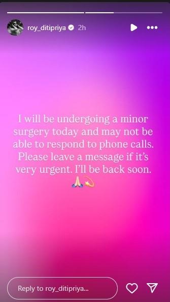 দিতিপ্রিয়া তাঁর ইনস্টাগ্রাম স্টোরিতে লেখেন, আমার একটি ছোট অস্ত্রোপচার হবে। যদি কেউ যোগাযোগের চেষ্টা করেন, পাবেন না। আমি পরে যোগাযোগ করে নেব। হঠাৎ কী হল ছোটপর্দার নায়িকার? দিতিপ্রিয়ার হাড়ের সমস্যা দেখা দিয়েছে। সেটারই অস্ত্রোপচার হবে বলে জানা গিয়েছে। প্রায় ২ বছর আগেই এই অস্ত্রোপচার হওয়ার কথা ছিল। কিন্তু সেটা কাজ ও পড়াশোনার কারণে হয়ে ওঠেনি। তবে এখন না করলেই নয়। তাই লক্ষ্মীপুজো মিটতেই নাকের অপারেশন করিয়ে নিচ্ছেন দিতিপ্রিয়া।