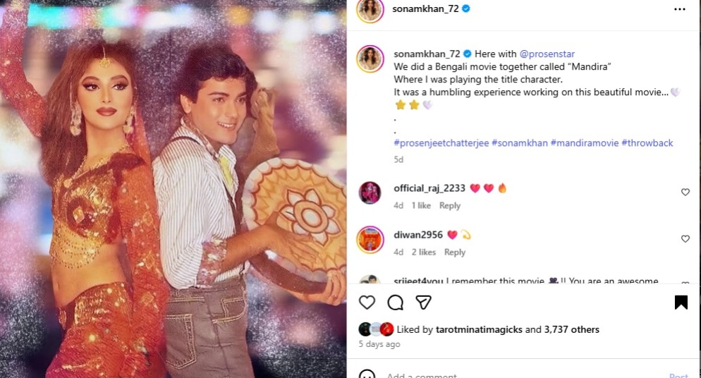 চাঙ্কি পাণ্ডে, নাসিরুদ্দিন শাহ, ঋষি কাপুর, জ্যাকি শ্রফ, সলমন খান সহ একাধিক হিরোর বিপরীতে কাজ করেছেন সোনম। তাঁর সৌন্দর্য সেই সময় অনেক পুরুষের রাতের ঘুম উড়িয়েছিল। সোনম আজও একইভাবে বোল্ড ও গ্ল্যাামারস রয়েছেন। তাঁর সোশ্যাল মিডিয়ায় ঢুঁ মারলেই তাঁর সেই সব সাহসী ছবি দেখতে পারবেন। সেই সোনমের সঙ্গেই ১৯৯০ সালে প্রসেনজিতের সঙ্গে প্রথম বাংলা ছবি করেন, যার নাম মন্দিরা। এর পরিচালক ছিলেন সুজিত গুহ।