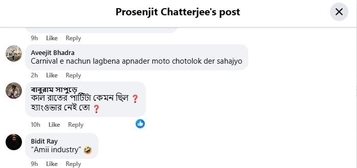 প্রসেনজিৎ-এর এই লেখা পোস্ট হতেই তাঁকে ট্রোল করতে শুরু করে দেন নেটিজেনদের একাংশ। কেউ লেখেন, স্টেজে নেচে এতক্ষণে সময় হয়েছে ইন্ডাস্ট্রির। আবার কেউ লেখেন, কার্নিভালে নাচুন। কেউ লেখেন, কার্নিভালে নাচুন লাগবেনা আপনাদের মতো ছোটলোকদের সাহায্য। কেউ লেখেন, আগে আপনাদের অন্য রকম মানুষ ভাবতাম। এখন দেখি পুরো টলিউডের বেশিরভাগ মানুষই পুরো ধান্দাবাজ। সব চটির তলায় নিজেদের বিক্রি করে দিয়েছে। এই ট্রোল-কটাক্ষের বিরুদ্ধে প্রসেনজিৎ অবশ্য কোনও জবাব দেননি।