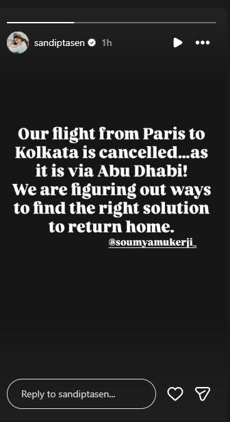 সন্দীপ্তা তাঁর ইনস্টাগ্রাম স্টোরিতে পোস্ট করে গোটা ঘটনাটি জানান। অভিনেত্রী বলেন, আমাদের বিমান প্যারিস থেকে দুবাই হয়ে কলকাতায় আসার কথা ছিল। কিন্তু তা বাতিল হয়ে গিয়েছে। আমরা চেষ্টা করছি কীভাবে কলকাতায় ফেরা যায়। প্রসঙ্গত, বর সৌম্যর সঙ্গে প্যারিসে ঘুরতে গিয়েছিলেন অভিনেত্রী। সেখান থেকে বেশ কিছু ছবি ও ভিডিও শেয়ার করেন। ফিনল্যান্ডে গিয়ে বরফ নিয়ে খেলাও করতে দেখা যায় তাঁকে। কিন্তু বাড়ি ফেরার সময় এরকম বিপদে যে পড়বেন তিনি তা তিনি বুঝতেও পারেননি।