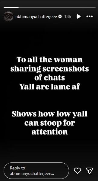 এমনিতে শ্রাবন্তী-পুত্র লাইমলাইট থেকে নিজেকে দূরে রাখতেই ভালোবাসেন। খুব একটা তাঁকে সোশ্যাল মিডিয়ায় সক্রিয় হতেও দেখা যায় না। তবে ঋজুর পাশে দাঁড়িয়ে অভিমন্যু তথা ঝিনুক লেখেন, যে সব মহিলা ব্যক্তিগত কথোপকথনের স্ক্রিনশট ভাগ করে নিচ্ছেন তাঁরা নিতান্তই বোকা। নজরে আসার জন্য কতটা নীচে নামতে পারেন তাঁরা, তা বেশ বোঝা যাচ্ছে। যদিও শ্রাবন্তী-পুত্র কোথাও ঋজুর নাম নেননি কিন্তু তিনি পরোক্ষভাবে টেলি অভিনেতাকে সমর্থন জানিয়েছেন।
