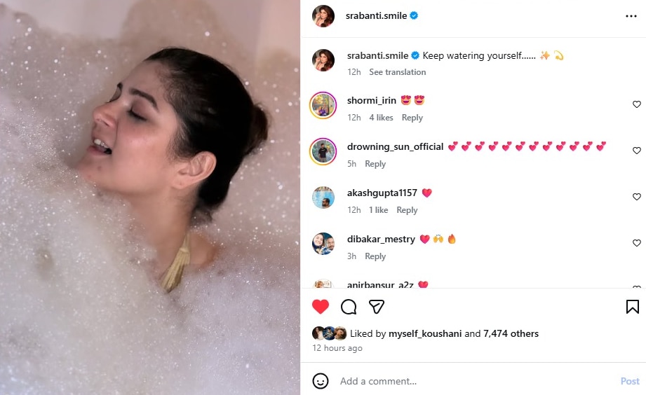 শ্রাবন্তীর পোস্ট করা একটি ছবিতে দেখা গিয়েছে একঝাঁক ফেনার মধ্যে শরীর ডুবিয়ে রয়েছেন শ্রাবন্তী। চুল উঁচু করে বাধা, মুখে নেই কোনও মেকআপ। এই শীতের মরশুমেও তিনি যে স্নান করাটা উপভোগ করছেন, তা বোঝাই যাচ্ছে। নায়িকা এই ছবির ক্যাপশনে লেখেন, নিজেকে জল দিতে থাকুন। নেটপাড়ায় শ্রাবন্তীর এই ছবি রীতিমতো ঝড় তুলেছে। নেটিজেনরা অনেকেই নায়িকার রূপের প্রশংসায় পঞ্চমুখ। সোশ্যাল মিডিয়ায় ভীষণভাবে সক্রিয় থাকেন শ্রাবন্তী। মাঝে মধ্যেই নিজের বোল্ড ছবি পোস্ট করে আগুন ধরান সোশ্যাল মিডিয়ায়।