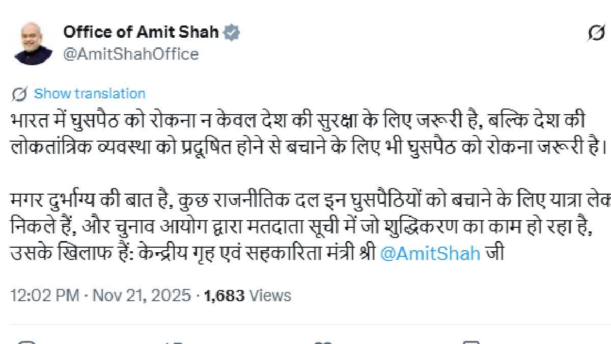 শুক্রবার একটি পোস্ট করেন শাহ। সেখানেই তিনি অনুপ্রবেশ নিয়ে নিজের মত জানান। পাশাপাশি যারা ভোটার তালিকার নিবিড় সংশোধনের বিরোধীতা করছেন, তাদের বিরুদ্ধে আওয়াজ তোলেন। আর তাঁর এই পোস্টের লক্ষ্য যে মমতা বন্দ্যোপাধ্যায়, সেটাই মনে করছেন অনেক রাজনৈতিক বিশেষজ্ঞরা।