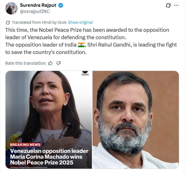 পাঁচবারের লোকসভার সাংসদের সঙ্গে মাচাদোর একটি ছবি শেয়ার করে রাজপুত হিন্দিতে এক্স-এ লিখেছেন: "এবার, সংবিধান রক্ষার জন্য ভেনেজুয়েলার বিরোধীদলীয় নেতাকে নোবেল শান্তি পুরষ্কার দেওয়া হয়েছে। ভারতের বিরোধীদলীয় নেতা শ্রী রাহুল গান্ধী, দেশের সংবিধান রক্ষার লড়াইয়ে নেতৃত্ব দিচ্ছেন"।