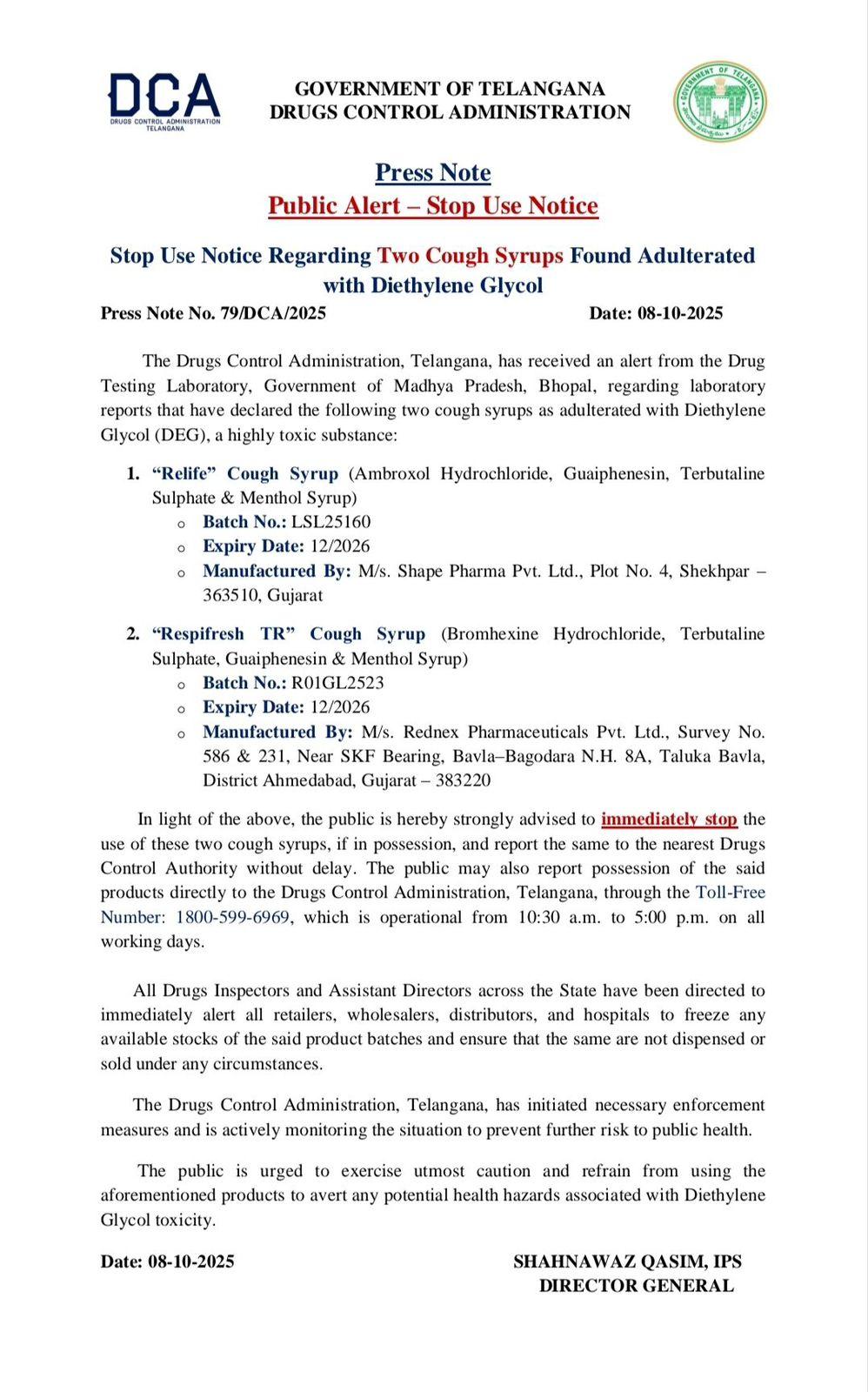 কোল্ডরিফের পাশাপাশি তেলঙ্গানায় নিষিদ্ধ হল দু'টি সিরাপ। সেই রাজ্যে Relife সিরাপ এবং Respifresh TR সিরাপ নিষিদ্ধ করা হয়েছে।