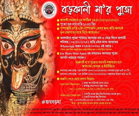 সোমবার ২০ অক্টোবর (২রা কার্তিক) কালীপুজো। এইদিন অমাবস্যা তিথি শুরু হবে দুপুর ২টো ৫৭ মিনিট থেকে। বড়মার মন্দিরে বড়কালী মায়ের পুজো শুরু হবে রাত ১২টা থেকে। পুষ্পাঞ্জলির সময় রাত ২টো। তবে পুষ্পাঞ্জলির জন্য অতি অবশ্যই ভক্তদের ফুল-বেলপাতা সঙ্গে নিয়ে আসতে হবে। অনেকেই এই সময় মানত পূরণ হলে দন্ডি কাটেন। সেই দন্ডির সময় ভোর থেকে সন্ধ্যে ৬টা পর্যন্ত। তবে এখন আ অনলাইনে পুজো পাঠানোর সময় ও তারিখ দুটোই পেরিয়ে গিয়েছে। বড়কালী মায়ের পুজো সরাসরি সম্প্রচার হবে এঁদের অফিসিয়াল ফেসবুক ও ইউটিউবে।