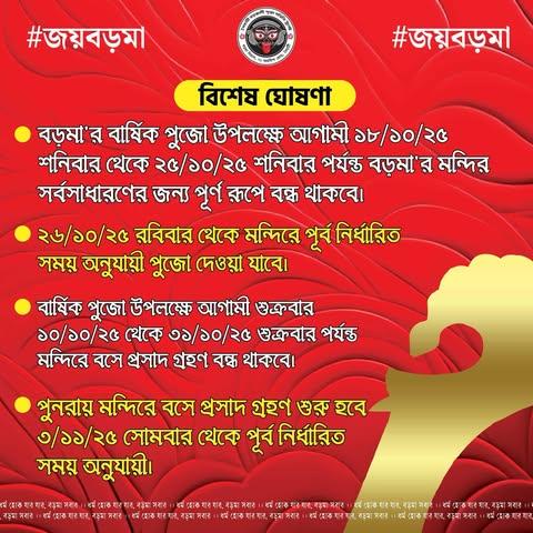মন্দির কর্তৃপক্ষের তরফ থেকে বিবৃতি দিয়ে বলা হয়েছে, বড়মার বার্ষিক পুজো উপলক্ষ্যে আগামী ১৮ অক্টোবর শনিবার থেকে ২৫ অক্টোবর পর্যন্ত শনিবার বড়মার মন্দির সর্বসাধারণের জনয পূর্ণরূপে বন্ধ থাকবে। ২৬ অক্টোবর রবিবার থেকে মন্দিরে পূর্ব নির্ধারিত সময় অনুযায়ী পুজো দেওয়া হবে।
