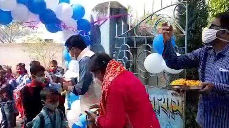 Students are greeted with flowers at school at birbhum on the day of school reopening after covid