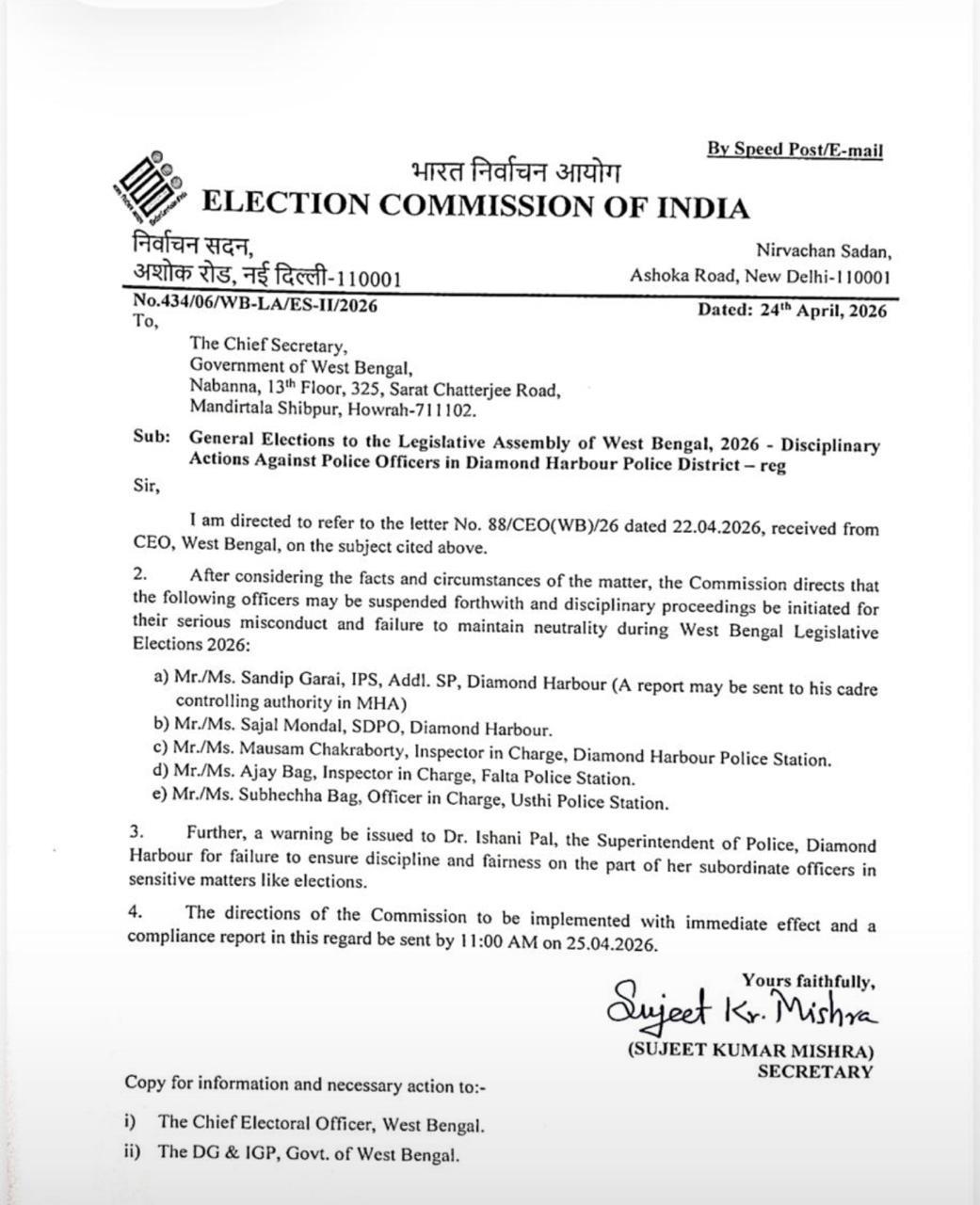 ডায়মন্ড হারবারে পুলিশ সাসপেন্ডদ্বিতীয় দফা ভোটের আগে ফের কড়া কমিশন। এবার ২০২৬-এর নির্বাচনের সময় আচরণবিধির গুরুতর লঙ্ঘন ও পক্ষপাতিত্বের অভিযোগে ডায়মন্ড হারবার এলাকার অতিরিক্ত পুলিশ সুপার সহ পাঁচজন পুলিশ আধিকারিককে অবিলম্বে সাসপেন্ড করেছে কমিশন। সেই মর্মে মুখ্য সচিবকে চিঠি দিয়েছে তারা।