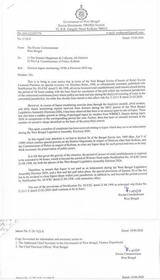 এতদিন মনে করা হচ্ছিল, ভোটের ৪৮ ঘণ্টা আগে থেকে মদের দোকান বন্ধ করা হবে। তবে এবার আরও আগে, ৯৬ ঘণ্টা আগে থেকেই বন্ধ করা হল মদের দোকান। যার সহজ অর্থ হল দুই দিনের বদলে চার দিনের জন্য বন্ধ থাকবে মদের দোকান।
