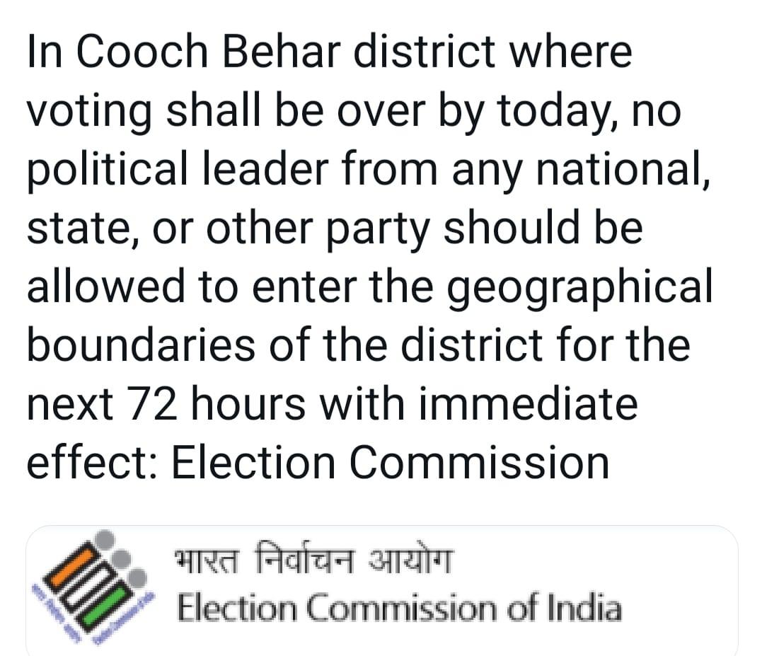 নির্বাচন কমিশনচতুর্থ দফার ভোটে সব হাইলাইট কেড়ে নিয়েছে কোচবিহারের শীতলকুচি। প্রাণ গিয়েছে ৫ জনের। এই আবহে বাংলার রাজনীতি উত্তপ্ত হচ্ছে। তৃণমূল ও বিজেপি একে অপরের বিরুদ্ধে সুর চড়াচ্ছে। রবিবার তিনি শীতলকুচি গিয়ে মৃতদের পরিবারের সঙ্গে দেখা করবন জানিয়েছেন তৃণমূলনেত্রী। আর এই আবহেই কড়া পদক্ষেপ করল কমিশন। জানিয়ে দিল আগামী ৭২ ঘণ্টার জন্য কোচবিহারে প্রবেশ করতে পারবেন না কোনও রাজনৈতিক দলের নেতা-নেত্রী। ফলে রবিবার তৃণমূলনেত্রীর সফর কার্যত প্রশ্নের মুখে পড়ে গেল।
