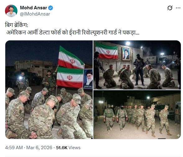 ছবিগুলি শেয়ার করে একে মার্কিন ডেল্টা ফোর্সের সদস্যদের দৃশ্য বলে দাবি করা হচ্ছে। ক্যাপশনে লেখা হয়েছে, “ডেল্টা ফোর্সের অভিযান ব্যর্থ: ইরানের হাতে বন্দি বহু মার্কিন সেনা, তেহরানের বার্তা এটা ভেনেজুয়েলা নয়। মধ্যপ্রাচ্যে উত্তেজনার মধ্যেই নতুন করে আলোচনায় এসেছে একটি ব্যর্থ মার্কিন সামরিক অভিযান। বিভিন্ন সূত্রের দাবি অনুযায়ী, যুক্তরাষ্ট্রের বিশেষ বাহিনী ডেল্টা ফোর্স ইরানের ভেতরে একটি গোপন অভিযান চালানোর চেষ্টা করেছিল। তবে সেই অভিযান সফল হয়নি এবং পরিস্থিতি দ্রুত ইরানের নিয়ন্ত্রণে চলে যায়। ইরানের পক্ষ থেকে দাবি করা হয়েছে, অভিযানের সময় বহু মার্কিন সেনা তাদের হাতে বন্দি হয়েছে। এ বিষয়ে ইরানের কড়া বার্তা— তেহেরান বলছে এটা ইরান, ভেনেজুয়েলা নয়। এখানে এমন অভিযান চালাতে এলে তার মূল্য দিতে হবে।”