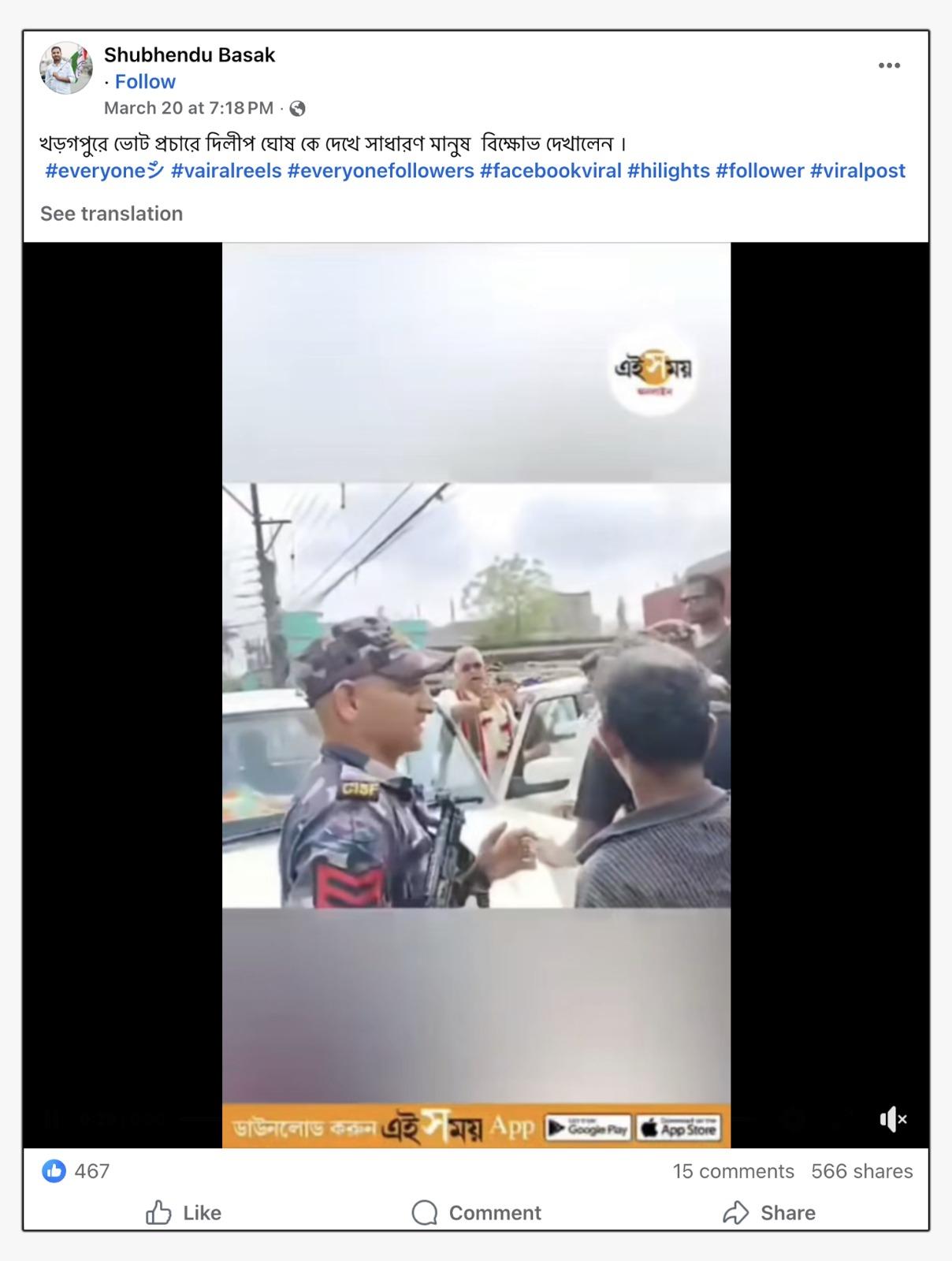 ভিডিওতে দেখা যাচ্ছে, একদল মানুষ দিলীপ ঘোষকে ঘিরে 'দূর হটো' স্লোগান দিচ্ছেন। ভিডিওটি পোস্ট করে ক্যাপশনে লেখা হয়েছে, "খড়গপুরে ভোট প্রচারে দিলীপ ঘোষ কে দেখে সাধারণ মানুষ বিক্ষোভ দেখালেন।"