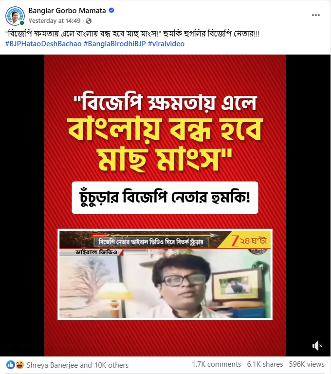 অর্থাৎ, বুঝতে বাকি থাকে না যে হুগলীর বিজেপির নেতা সপ্তর্ষি বন্দ্যোপাধ্যায়ের একটি সম্পাদিত ও ভুয়ো ভিডিও প্রচার করে মিথ্যে দাবি করা হয়েছে এই বলে, যে তিনি নাকি হুমকি দিয়েছেন যে বিজেপি রাজ্যে ক্ষমতায় এলে মাছ-মাংস নিষিদ্ধ করে দেবে।