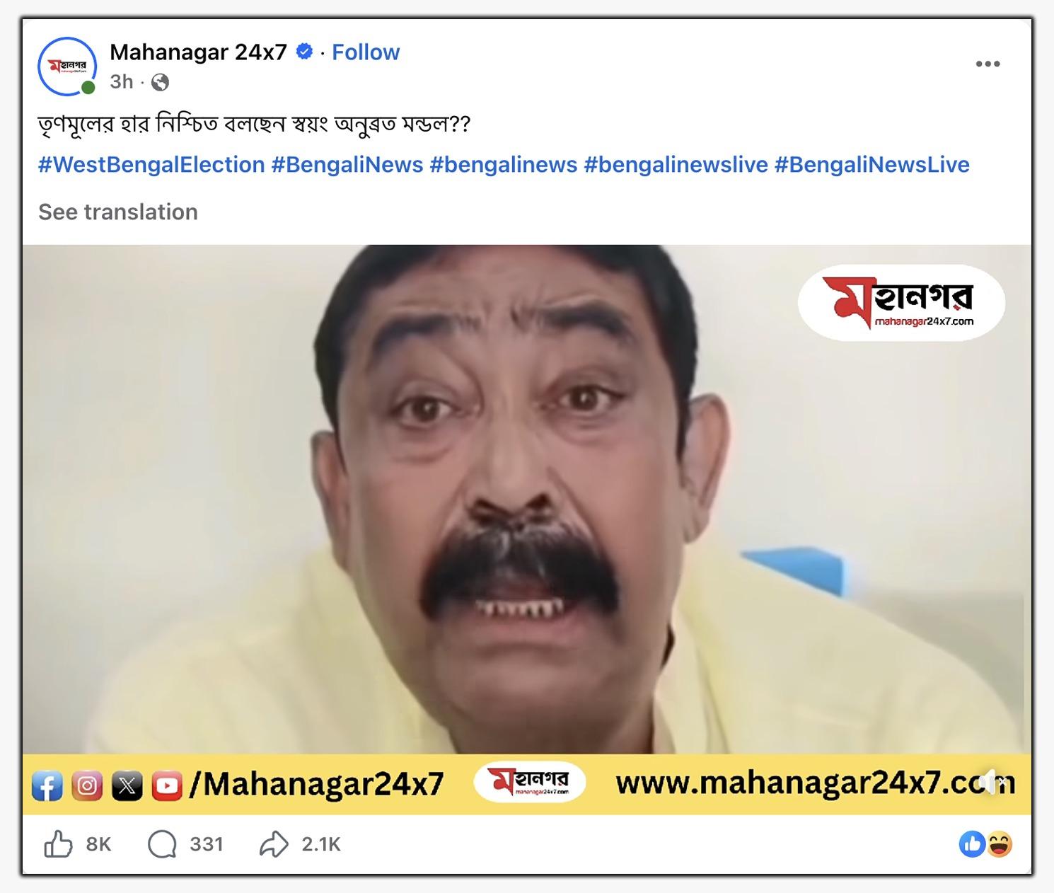 কোনও কোনও পেজ থেকে আবার একই ভিডিও পোস্ট করে লেখা হয়েছে, “তৃণমূলের হার নিশ্চিত বলছেন স্বয়ং অনুব্রত মন্ডল??”