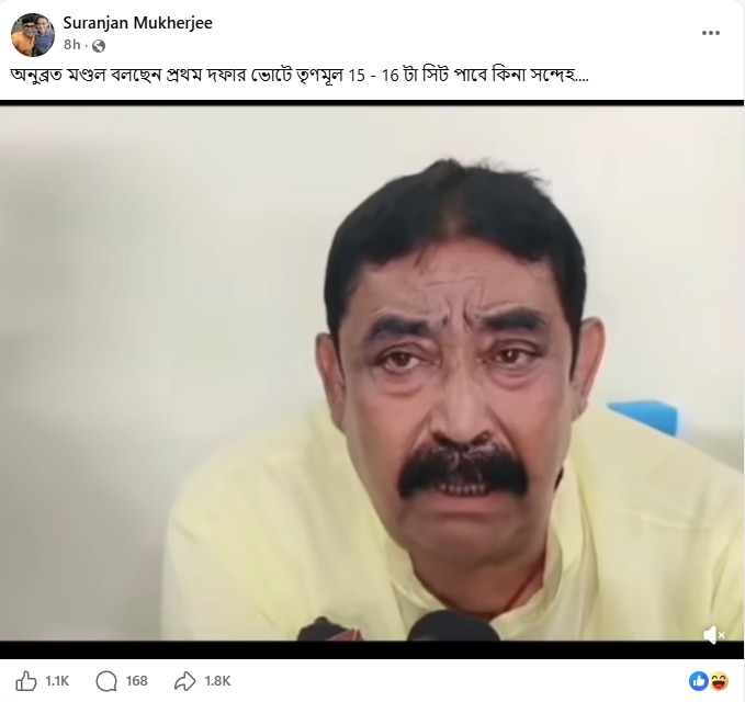 ভিডিওটি পোস্ট করে কেউ লিখেছেন, “অনুব্রত মণ্ডল বলছেন প্রথম দফার ভোটে তৃণমূল 15 - 16টা সিট পাবে কিনা সন্দেহ....।”