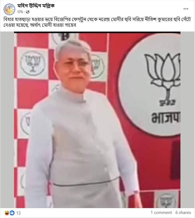 বিহারে বিধানসভা নির্বাচনে প্রথম দফার ভোটগ্রহণ হয়ে গিয়েছে। এই আবহে সোশ্যাল মিডিয়ায় বিহারের মুখ্যমন্ত্রী নীতীশ কুমারের ছবি থাকা বিজেপির একটি ব্যানার তুলে ধরে দাবি করা হচ্ছে, হারের ভয়ে বিজেপির ব্যানার থেকে প্রধানমন্ত্রী নরেন্দ্র মোদীর ছবি সরিয়ে নীতীশ কুমারের ছবি লাগিয়ে দেওয়া হয়েছে।