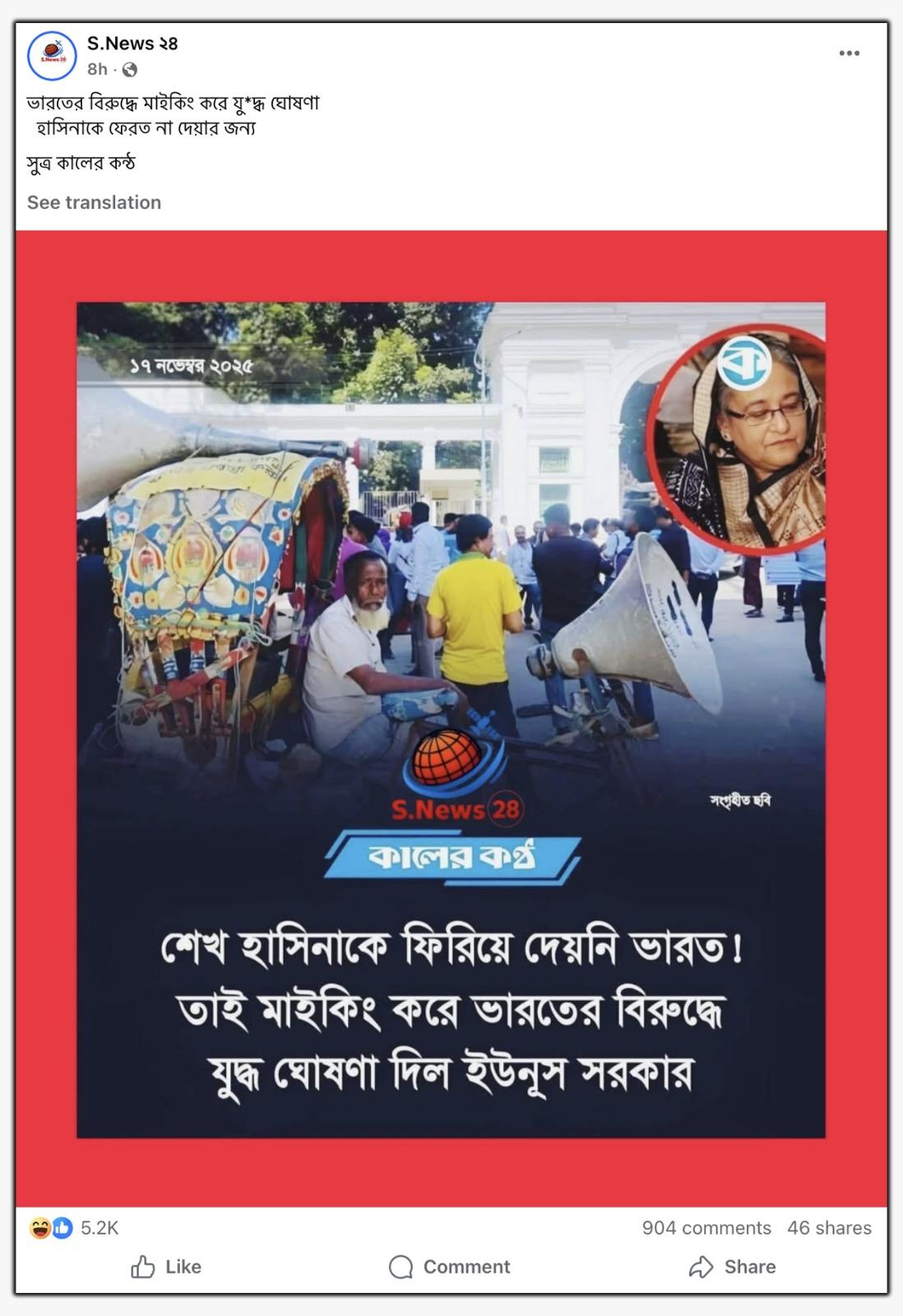 পোস্টের ক্যাপশনে লেখা হয়েছে, “ভারতের বিরুদ্ধে মাইকিং করে যু*দ্ধ ঘোষণা। হাসিনাকে ফেরত না দেয়ার জন্য। সুত্র কালের কন্ঠ।”