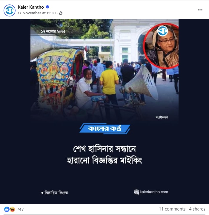 এই পোস্টের প্রথম কমেন্টে লিঙ্ক থাকা প্রতিবেদন থেকে জানা যায়, কেউ হারিয়ে গেলে তার সন্ধান করতে যেভাবে মাইকিং করা হয়, ঠিক একই ভাবে শেখ হাসিনার সন্ধানে গত ১৭ নভেম্বর মাইকিং করা হয় আন্তর্জাতিক অপরাধ ট্রাইব্যুনাল চত্বরে। এই ট্রাইব্যুনালেই শেখ হাসিনা-সহ বাংলাদেশের প্রাক্তন স্বরাষ্ট্রমন্ত্রী আসাদুজ্জামান কামাল খানকে মানবতাবিরোধী অপরাধে দোষী সাব্যস্ত করে মৃত্যুদণ্ডের সাজা দেওয়া হয়েছে।