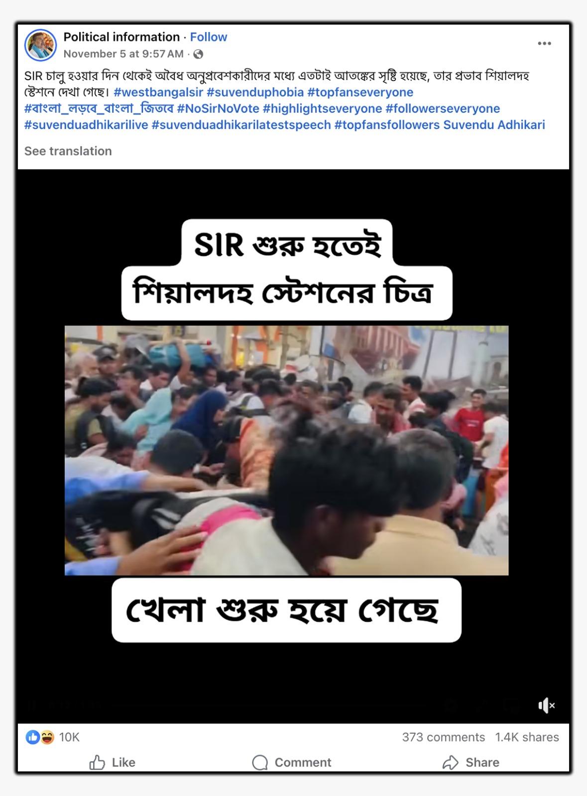 উদাহরণস্বরূপ, এক ফেসবুক ব্যবহারকারী ভাইরাল ভিডিওটি শেয়ার করে লিখেছেন, “SIR চালু হওয়ার দিন থেকেই অবৈধ অনুপ্রবেশকারীদের মধ্যে এতটাই আতঙ্কের সৃষ্টি হয়েছে, তার প্রভাব শিয়ালদহ স্টেশনে দেখা গেছে।” পাশাপাশি, ভিডিওর ফ্রেমের উপর লেখা হয়েছে, “SIR শুরু হতেই শিয়ালদহ স্টেশনের চিত্র, খেলা শুরু হয়ে গেছে।” (সব বানান অপরিবর্তিত)