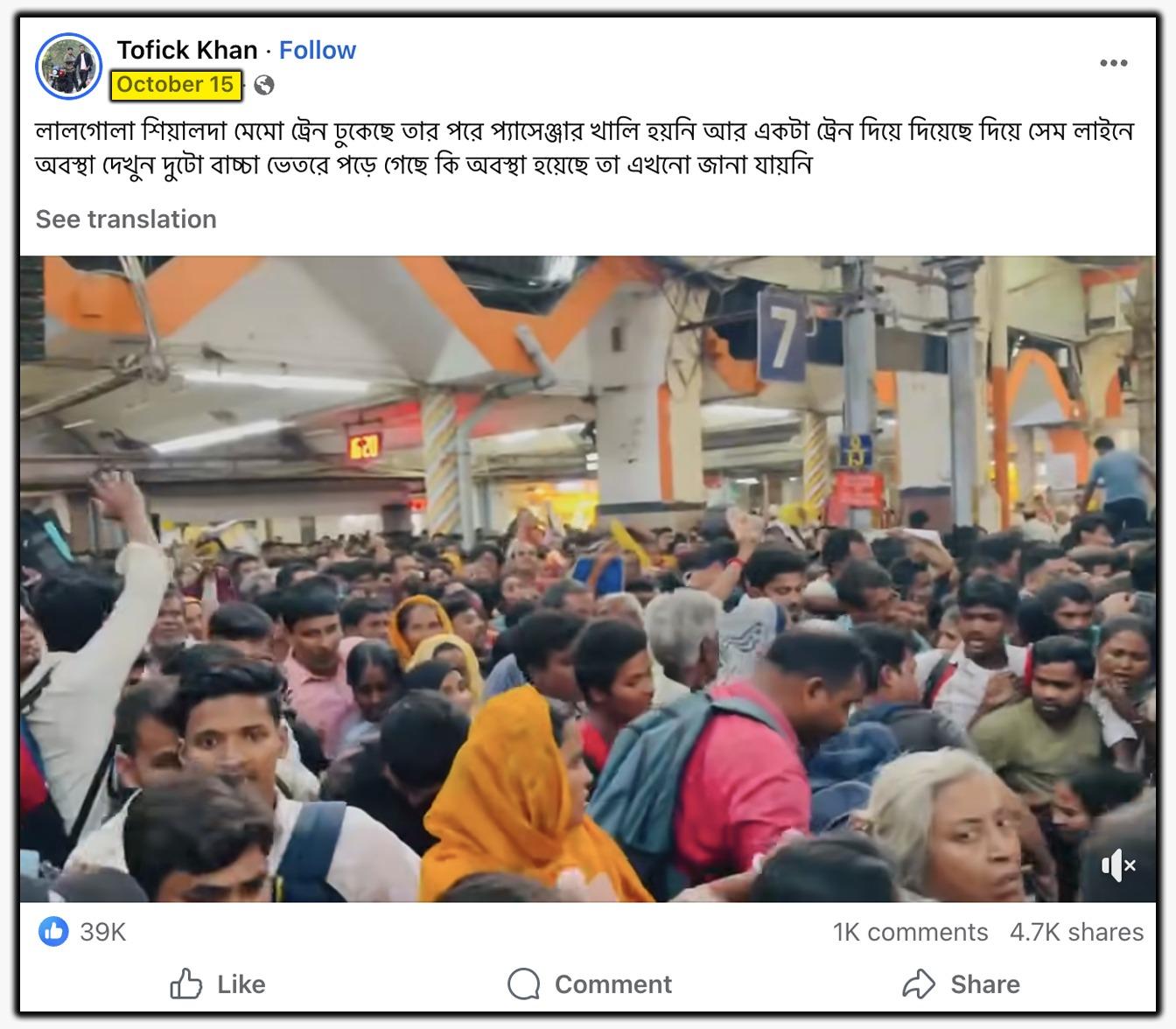 ভাইরাল ভিডিও এবং দাবির সত্যতা জানতে সেটি থেকে একাধিক কিফ্রেম সংগ্রহ করে সেগুলি গুগলে রিভার্স ইমেজ সার্চ করলে ২০২৫ সালের ১৫ অক্টোবর তৌফিক খান নামক একটি ফেসবুক প্রোফাইলে এই একই ভিডিও পাওয়া যায়। ভিডিওটি শেয়ার করে ক্যাপশনে লেখা হয়েছে, “লালগোলা শিয়ালদা মেমো ট্রেন ঢুকেছে তার পরে প্যাসেঞ্জার খালি হয়নি আর একটা ট্রেন দিয়ে দিয়েছে দিয়ে সেম লাইনে অবস্থা দেখুন দুটো বাচ্চা ভেতরে পড়ে গেছে কি অবস্থা হয়েছে তা এখনো জানা যায়নি।”