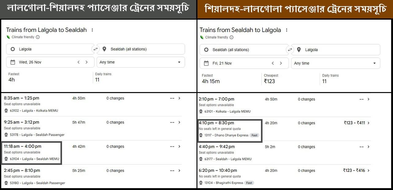 অন্যদিকে, শিয়ালদহ-লালগোলা প্যাসেঞ্জার ট্রেনের সময়সূচি পর্যবেক্ষণ করার সময় লক্ষ্য করা যায় যে, শিয়ালদহ স্টেশন থেকে বিকাল ৪টে ১০ মিনিটে একটি ট্রেন লালগোলার জন্য ছাড়া হয়। যা রাত ৮টা ৩০ মিনিটে লালগোলা স্টেশনে পৌঁছায়। আর এই উভয় ট্রেনের শিয়ালদহ স্টেশনে পৌঁছনো এবং শিয়ালদহ স্টেশন থেকে ছাড়ার সময়ের সঙ্গে ভাইরাল ভিডিওতে প্ল্যাটফর্মের ঘড়ির সময়ের পার্থক্য খুবই কম। যে কোনও ট্রেন সামান্য লেট করলে যেটা হওয়া স্বাভাবিক। এর থেকে নিশ্চিত হওয়া যায় যে তৌফিকের দাবি সঠিক।
