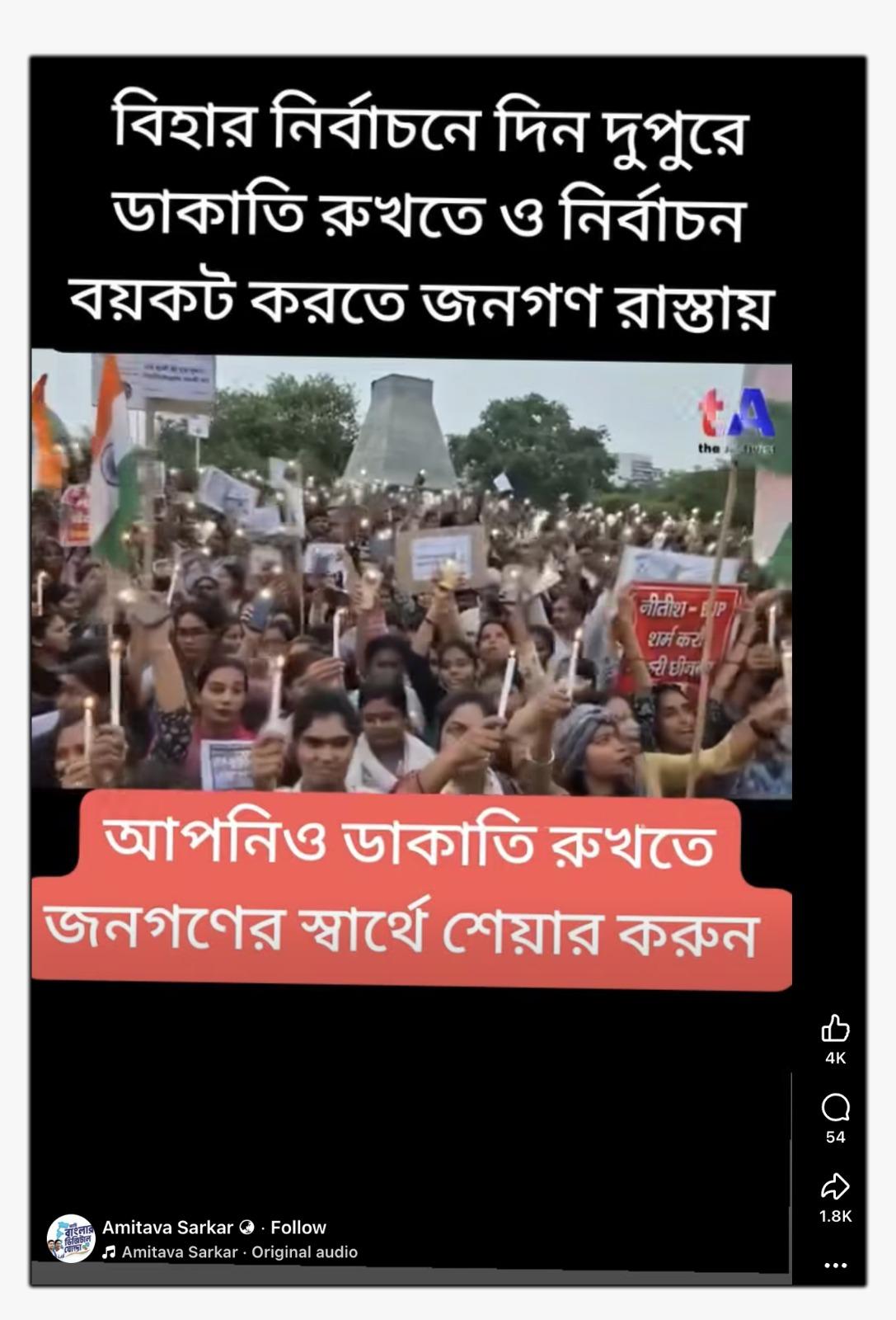 উদাহরণস্বরূপ, প্রথম ক্লিপটিতে কোনও একটি স্থানে শতশত যুবক-যুবতীকে হাতে মোমবাতি ও পোস্টার নিয়ে বিক্ষোভ প্রদর্শন করতে দেখা যাচ্ছে। ক্লিপটি শেয়ার করে এক ফেসবুক ব্যবহারকারী সেটির ফ্রেমের উপরে লিখেছেন, “বিহার নির্বাচনে দিন দুপুরে ডাকাতি রুখতে ও নির্বাচন বয়কট করতে জনগণ রাস্তায়। আপনিও ডাকাতি রুখতে জনগণের স্বার্থে শেয়ার করুন।” (সব বানান অপরিবর্তিত)