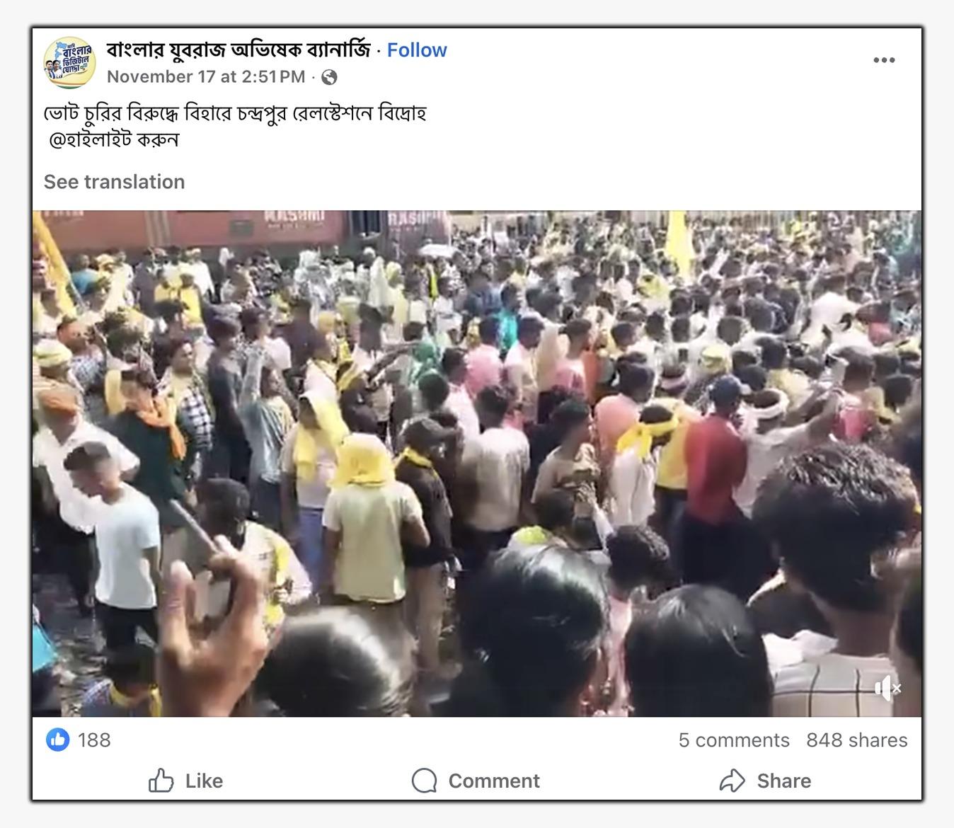 দ্বিতীয় ক্লিপটিতে কোনও একটি রেল স্টেশনে হাতে হলুদ রঙের পতাকা ও গলায় হলুদ গামছা জড়িয়ে অপেক্ষা করছেন হাজার হাজার মানুষ। পাশাপাশি, স্টেশানে দাঁড়িয়ে আছে দুটি ট্রেন। এই ভিডিওটি ফেসবুকে পোস্ট করে ক্যাপশনে লেখা হয়েছে, “ভোট চুরির বিরুদ্ধে বিহারে চন্দ্রপুর রেলস্টেশনে বিদ্রোহ।”