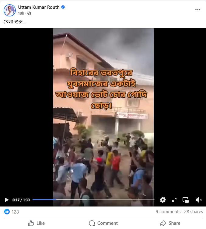 অন্যদিকে, তৃতীয় ভিডিওতে কয়েকশো বিক্ষোভকারীকে একটি ভবনে হামলা চালাতে এবং তাতে আগুন লাগিয়ে দিতে দেখা যাচ্ছে। এই ভিডিওটি পোস্ট করে এর ফ্রেমের উপরে লেখা হয়েছে, “বিহারের ভরতপুরে যুবসমাজের একটাই আওয়াজ ভোেট চোর গোদি ছোেড়।”