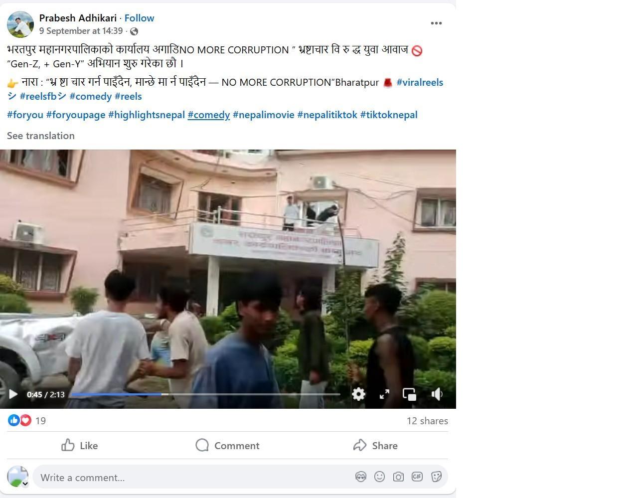 তৃতীয় ক্লিপ: তৃতীয় ক্লিপটি ভালো করে পর্যবেক্ষণ করার সময় অগ্নিদগ্ধ ভবনটির সামনে একটি ব্যানারে নেপালি ভাষয়া “भरतपुर महानगरपालिकाको’ বা ‘ভরতপুর মেট্রোপলিটন পৌরসভা’ লেখা দেখতে পাওয়া যায়। উক্ত সূত্র ধরে পরবর্তী অনুসন্ধান চালালে ২০২৫ সালের ৯ সেপ্টেম্বর নেপাল ভিত্তিক একটি ফেসবুক প্রোফাইলে অন্য অ্যাঙ্গেল থেকে তোলা এই একই ভবনে হামলা, অগ্নিসংযোগ ও বিক্ষোভের ভিডিও পাওয়া যায়। ভিডিওটি শেয়ার করে নেপালি ভাষায় সেখানে উল্লেখ করা হয়েছে, “দুর্নীতি এবং সাধারণ মানুষ হত্যার বিরুদ্ধে ভরতপুর মেট্রোপলিটন সিটি অফিসের সামনে জেন-জি এবং জেন-ওয়াইদের বিক্ষোভ।” এর আগেও এই একই ভিডিও শেয়ার করে সেটিকে লাদাখের বিজেপির কার্যালয়ে হামলার দৃশ্য বলে সামাজিক যোগাযোগ মাধ্যমে প্রচার করা হয়েছিল। সেই সময় আজতক বাংলার তরফে সেই ভিডিওটুর বিস্তারিত ফ্যাক্টচেক করা হয়েছিল। সেই ফ্যাক্টচেক প্রতিবেদনটি দেখতে এখানে ক্লিক করুন।