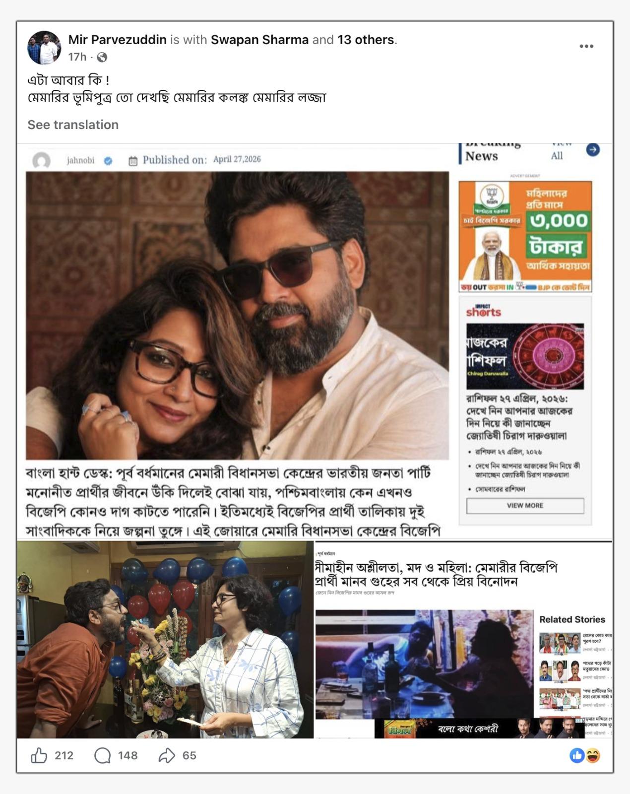 ভোটগ্রহণের একদিন বাকি থাকতেই সোশ্যাল মিডিয়াতে এই সময় ও বাংলা হান্টের দুটি কথিত প্রতিবেদনের স্ক্রিনশট ছড়িয়ে পড়েছে। উভয়ই মেমারির বিজেপি প্রার্থী মানব গুহকে নিয়ে। এই সময়ের যে কথিত প্রতিবেদনের স্ক্রিনশট ভাইরাল হয়েছে, তার শিরোনামে লেখা হয়েছে, সীমাহীন অশ্লীলতা, মদ ও মহিলা: মেমারীর বিজেপি প্রার্থী মানব গুহের সব থেকে প্রিয় বিনোদন।