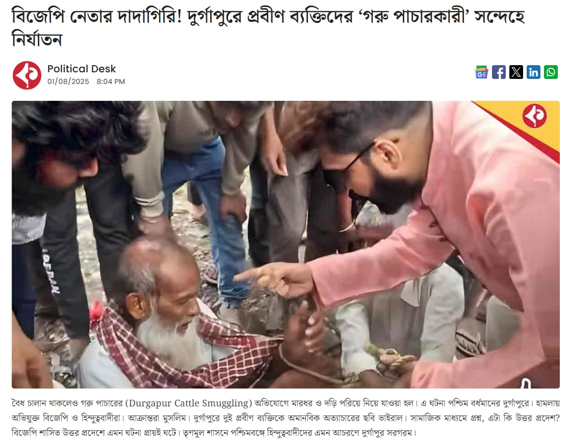 এই সূত্র ধরে কিওয়ার্ড সার্চ করা হলে চলতি বছর ১ অগস্ট কলকাতা ২৪x৭ এবং ২ অগস্ট সংবাদ প্রতিদিনে প্রকাশিত বেশ কিছু রিপোর্ট পাওয়া যায়। এই রিপোর্টগুলো থেকে জানা যায়, ৩১ জুলাই দুর্গাপুরের কোকওভেন থানার গ্যামন ব্রিজ এলাকায় বাঁকুড়ার হাট আশুড়িয়া থেকে গরু কিনে ফেরার সময় কয়েকজন মুসলিম ব্যবসায়ীকে নিগ্রহ এবং হেনস্থা করে জনাকয়েক বিজেপি কর্মীরা।