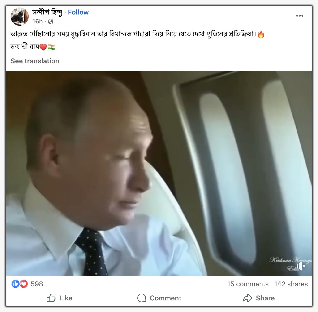 ভিডিওটি পোস্ট করে দাবি করা হচ্ছে যে, পুতিন ভারতে আসার আগে ভারতীয় বায়ুসেনা ঠিক এভাবেই তাঁকে এসকর্ট করে নিয়ে এসেছে। ভিডিওটি পোস্ট করে ক্যাপশনে অনেকেই লিখেছেন, “ভারতে পৌঁছানোর সময় যুদ্ধবিমান তার বিমানকে পাহারা দিয়ে নিয়ে যেতে দেখে পুতিনের প্রতিক্রিয়া।”