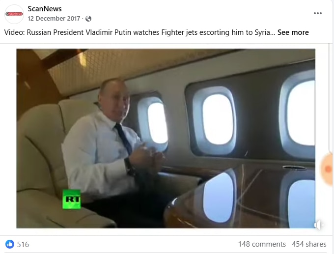 এই বিষয়ে আরও কিওয়ার্ড সার্চ হলে ইউরো নিউজ ইংলিশের ফেসবুক পেজে ওই একই ভিডিও পাওয়া যায় যা ২০১৭ সালের ১৩ ডিসেম্বর পোস্ট করে লেখা হয়, রাশিয়ান যুদ্ধবিমানের পাহারার মধ্যে দিয়ে পুতিন সিরিয়া গিয়ে পৌঁছন।